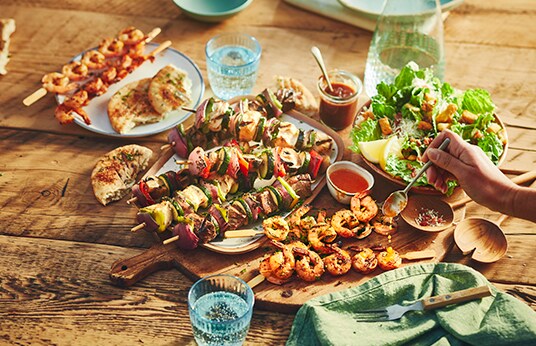 Make BBQ skewers with pre-made meat, veggies, and seafood.